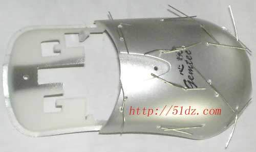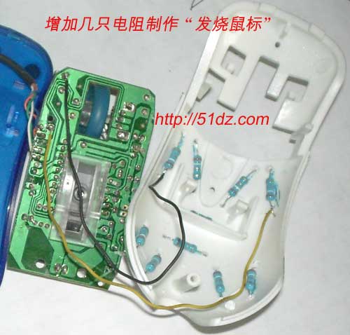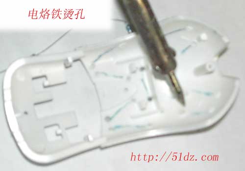 拆出上盖,确定电阻的安装位置,要求尽可能的大面积分布,并且均匀分布,但是又要不防碍装回去会碰到任何部位。最后用电烙铁在鼠标壳上烫孔,以便电阻的引脚穿出焊接,或者你可以用电钻钻孔。(注意:这不是一个好方法,用电烙铁烫孔更不是一个好习惯,有损烙铁头的寿命,还会影响焊接。但是,电阻脚伸到外部焊接可以方便固定电阻,也利于热量传出,只不过,外观就难看了。否则的话,就只能用快干胶来固定电阻了,那会花费更多的时间,并且还需要胶水。)
