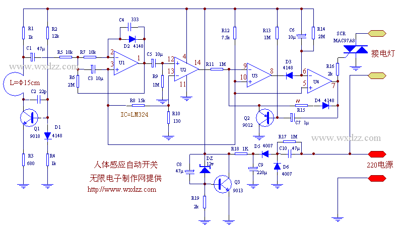 工作原理如下:天线圈 、Q1、C2等组成微波振荡电路,由天线线圈向空间辐射,在其周围产生一个半径约10m的微波磁场。如有人或金属物体在微波场内移动,将引起微波振荡器的频率微变,在电路中体现为天线端(R1的下端)电压的变化,C1将这一变化耦合到运放U1进行放大,运放U1的输出经C5在R9上形成较高变化电压,该电压的高低与物体的距离和移动的速度有关,通常在0-3V之间;运放U2接成比较器,参考电压在12V时为0.1V,当R9上的电压高于0.1V时,U2输出高电平经,过比较器U3比较输出低电平,D3导通、C6瞬间充电使比较器U4的6脚电压低于5脚,比较器7脚输出高电平,可控硅SCR导通,外接电灯点亮。如果此后微波场内不再有物体移动,C6上的电压经R14缓慢放电形成延时,当6脚电位高于5脚延时结束,AB输出低电平等待下次触发。Q2、R13、C7的加入可以在电路延时结束后的一段时间内(约5秒),C7充电,Q2导通,比较器U3的反相输入端9脚强行下拉为低电平,并保持低电平,D3反向截止,从而使电路可靠反转关断。光敏电阻R15经D4接至U4输出端,在输出高电平时,再强的光线照到R15上时,由于D4反偏,都不会使U3的9脚降为低电平,造成因光亮而误动作。