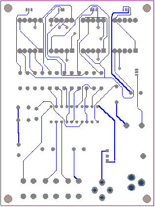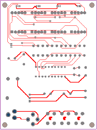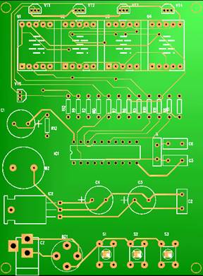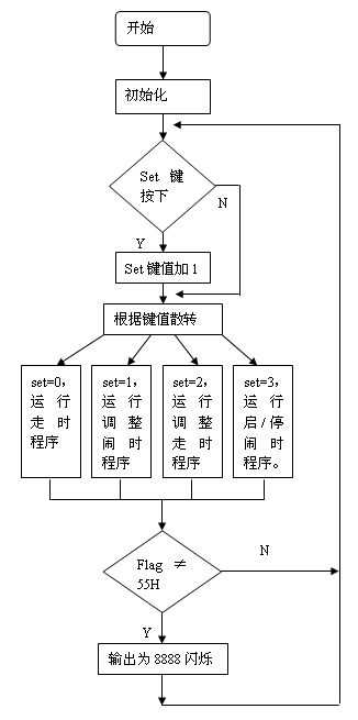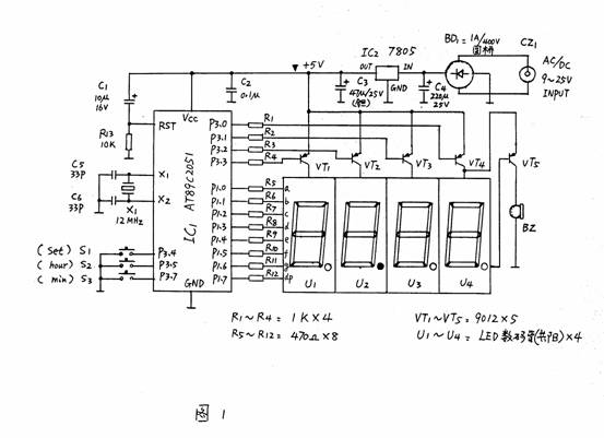 | 选择分类:当前分类——学单片机 相关联或者相类似的文章: 赠品说明以及免费大放送(1271) 用单片机控制字符型液晶显示模块(1249) 电子基础知识--电感(1239) 发光二极管的几种特殊用法(1236) 国产OS?中文CPU?(1213) 是否已经欺骗你的眼睛?(1213) 部分万用表电路图集(1197) MY8848网站销声匿迹 消费者(1196) 充满电磁波的天空 (1194) 请广大朋友千万不要信封寄钱!(1193) 有地下王国吗?(1182) 用AT89C2051设计超声波测距仪(1171) 小小电子闹钟 生活学习良伴(1165) 厨房定时器(1160) 求职技巧:求职必成6原则(1154) 印制电路板的可靠性设计(1154) 李鬼网站换个网址继续行骗(1151) 面试的多方位攻略(1146) 一只小狗的职场启发(1142) 网站在线管理系统(1141) 首页 前页 后页 尾页 本站推荐: | 小小电子闹钟 生活学习良伴 小小电子闹钟 生活学习良伴 ——— 一款电路极简的单片机电子钟设计详解 电路特点 这里介绍的电子钟,电路可称得上极简,它仅使用单片的20引脚单片机完成电子钟的全部功能,而笔者见到的其它设计方案均采用二片以上的多片IC实现。 电路见图1。 ![]() 一片20引脚的单片机AT89C2051为电子钟主体,其显示数据从P1口分时输出,P3.0~3.3则输出对应的位选通信号。由于LED数码管点亮时耗电较大,故使用了四只PNP型晶体管VT1~VT4进行放大。本来笔者还有一种更简的设计方案(见图2),可省去VT1~VT4及R1~R4八个元件,但这种设计由于单片机输出口的灌入电流有限(约20mA),数码管亮度较暗而不向读者介绍,除非你采用了高亮度的发光数码管。 ![]() P3.4、P3.5、3.7外接了三个轻触式按键,这里我们分别命名为:模式设定键set(P3.4)、时调整键hour(P3.5)、分调整键min(P3.7)。C1、R13组成上电复位电路。VT5及蜂鸣器Bz为闹时讯响电路。三端稳压器7805输出的5V电压供整个系统工作。此电子钟可与任何9~20V/100mA的交直流电源适配器配合工作,适应性强。 电子钟功能 1.走时:通过模式设定键set选择为走时,U1、U2显示小时,U3、U4显示分。U2的小数点为秒点,每秒闪烁一次。 2.走时调整:通过模式设定键set选择为走时调整,按下hour键对U1、U2的走时“时”显示进行调整(每0.2秒递加1)。按下min键对U3、U4的走时“分”显示进行调整(每0.2秒递加1)。 3.闹时调整:通过模式设定键set选择为闹时调整,按下hour键对U1、U2的闹时“时”显示进行调整(每0.2秒递加1)。按下min键对U3、U4的闹时“分”显示进行调整(每0.2秒递加1)。 4.闹时启/停设定:通过模式设定键set选择为闹时启/停设定,按下min键U3的小数点点亮,闹时功能启动;按下hour键U3的小数点熄灭,闹时功能关停。 由于电路设计得极其简单,因此丰富的功能只能由软件完成,这里软件设计成为了关键。下面介绍软件设计要点。 图3为主程序状态流程。 ![]() 图3 运行时建立的主要状态标志如下: flag—掉电标志。掉电后,flag内为一随机数;重新设定时间后flag内写入标志数55H。 set—工作模式设定标志。 hour—走时“时”单元。 min—走时“分”单元。 sec—走时“秒”单元。 deda—走时5mS计数单元 t_hour—闹时“时”单元。 t_min—闹时“分”单元。 d_05s—0.5秒位标志。每秒钟的前0.5秒置1,后0.5秒置0,以使秒点闪烁。 o_f—闹时启/停位标志。闹时启动置1,闹时关停置0。 另外将定时器T0设定为5mS的定时中断。这里晶振频率为12MHz,因此5mS的初值为-5000,但实际上程序还要作其它运算,使得时间偏长,经调整为-4800后试验刚好。计时单元deda每次中断均加1。走时函数判断deda>=200时即令秒单元sec加1。同理秒单元sec满60后令分单元min加1。分单元min满60后令时单元hour加1。时单元hour满24后清0。 上电后,首先进行初始化,对各状态标志、输入输出口及定时器T0进行初始化工作,以适应后面程序的要求。 随后程序判断有无set键按下,如按下,则set键值从0起加1。set键值只能从0加到3,然后又回到0。 接下来,根据键值进行散转。若set=0,运行走时程序;若set=1,进入调整闹时时间程序;若set=2,进入调整走时时间程序;若set=3,显示已调好的闹时时间,同时进入启/停闹时程序。 散转完后,进行判断掉电标志flag是否等于55H。若不等,说明刚开机上电或运行过程中掉过电,这时四个数码管以1Hz的频率闪烁四个8字,提示时间不准;若相等,说明未掉电,RAM区内容未变化,时间准确。 再下来程序又转回到初始化之后进行循环运行。 由于使用了四只数码管密集排列,因此只能采用双面印刷板设计,图4、5分别为正面(元件面)、反面的印板图。尺寸3000milx4000mil(7.62cmx10.16cm)。图6为计算机输出的三维仿真印制板。 ![]() 图4 ![]() 图5 ![]() 图6 元件选用 为了走时准确,晶振X最好选用温漂小的。四个数码管U1~U4可选用发绿光的,这样光泽较柔和。蜂鸣器Bz要购买绕线型的电动式蜂鸣器(市场上有一种加电压即工作的蜂鸣器这里不适用),因驱动信号为脉冲信号。其它元件一般无特殊要求。 使用方法 上电后,四个LED数码管闪烁四个8字。 按一下set键,闪烁现象消失(此时set=1),U1的小数点亮,说明此刻可以调整闹时时间。按下hour键,U1、U2作加法;按下min键,U3、U4作加法。这些调整好的数据被同时送入RAM区的闹时记忆“时”单元t_hour和闹时记忆“分”单元t_min。 再按一下set键,set=2,U2的小数点亮,此刻可以调整走时时间。按下hour键,U1、U2作加法;按下min键,U3、U4作加法。这些调整好的数据也被同步送入RAM区的“时”记忆单元hour和“分”记忆单元min。 再按一下set键,