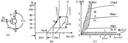 输出特性表示Ic随Uce的变化关系(以Ib为参数)从图2(C)所示的输出特性可见,它分为三个区域:截止区、放大区和饱和区。
