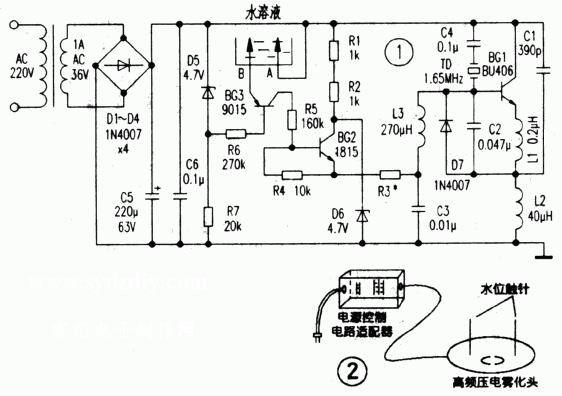 2.水位控制和偏置电路电路中的超声换能器TD(又称雾化头)和其上安装的两根水位控制触针,他们是浸没在浅水水溶液中工作的。若长期雾化,一旦液面降低而使雾化头的水位控制触针露出水面时,振荡器会自动停止工作,这也避免了雾化头因发热而损坏。