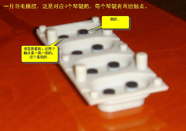 下面来看一下导电橡胶的样子:注意,每一个琴键都对应两个触点开关,嗯?为什么一个琴键需要两个“开关”呢,玄机就在这里哦。