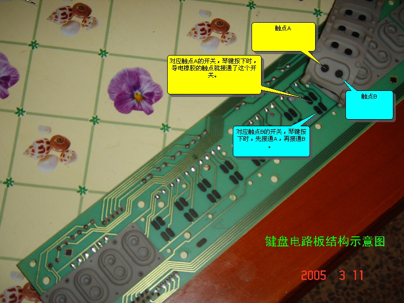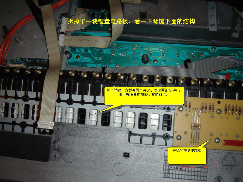 接下来这张:是拆下来这块键盘电路板的照片,大家根据图上的注解,理解琴