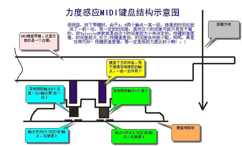 大家知道,最常用的MIDI输入设备就是MIDI键盘,包括专门的MIDI键盘以及合成器、电子琴、电钢琴等等,这些键盘是如何来产生力度参数的呢?