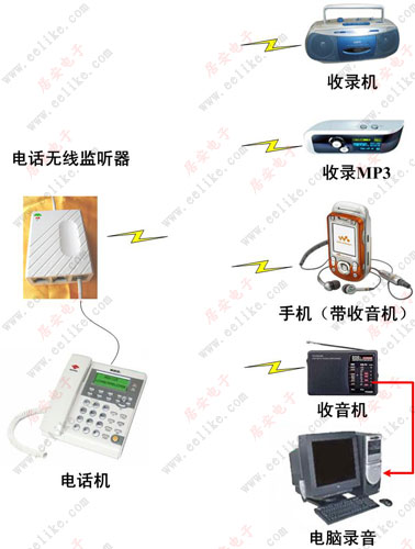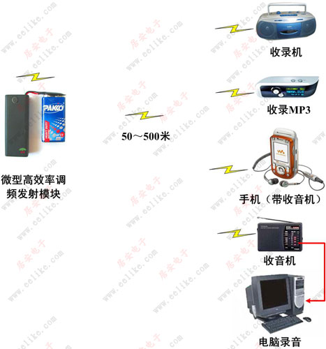 3、打开调频收音机,或者带有收音功能的手机、MP3,将接收频率调到标签所标的频率值上即可听到清晰的高保真立体声音乐了。 1、作为防盗系统使用,一旦有区域内有声响,立即启动监听和FM调频发射电路,同时远端的自动接收机(或FM收音机)开启,立刻监听现场的细微动静。 2、当环境声响波动时,才启动监听和FM调频发射电路,平时发射电路不工作,耗电极微,电池可以使用很长时间。 3、发射距离远。采用9V高电压供电,直线发射距离可达300米。 4、外观精美,背面可用双面胶纸粘贴在桌子底下下或者窗边、墙上,安装简单快捷。 5、可自由定制和调校发射频率。如果不想让普通收音机收到信号,可以调校频率避开普通FM广播频段(88Mhz~108Mhz),然后使用特殊接收机接收。 ![]() ![]() ![]() 工作电压:9V 主要应用:
