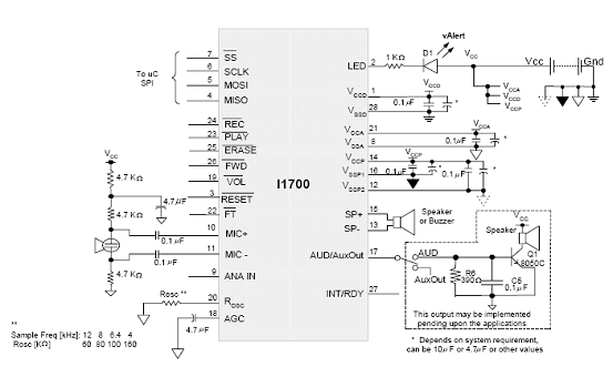 用户可利用震荡电阻来自定芯片的采样频率,从而决定芯片的录放时间和录放音质。下表为 ISD1700 的参数表: