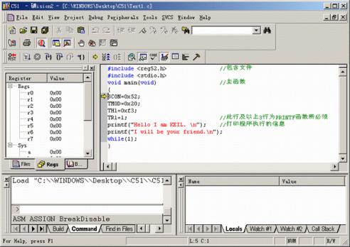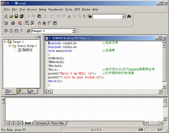 #include <stdio.h> void main(void) //主函数 { SCON=0x52; TMOD=0x20; TH1=0xf3; TR1=1; //此行及以上3行为PRINTF函数所必须 printf(“Hello I am KEIL. \n”); //打印程序执行的信息 printf(“I will be your friend.\n”); while(1); } 在输入上述程序时,读者已经看到了事先保存待编辑的文件的好处了吧,即Keil c51会自动识别关键字,并以不同的颜色提示用户加以注意,这样会使用户少犯错误,有利于提高编程效率。程序输入完毕后,如下图所示