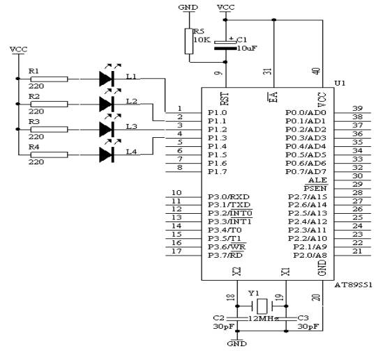 (3.       由于每次2秒定时到时,L1-L4要交替闪烁。采用ID来号来识别。当ID=0时,L1在闪烁,当ID=1时,L2在闪烁;当ID=2时,L3在闪烁;当ID=3时,L4在闪烁
