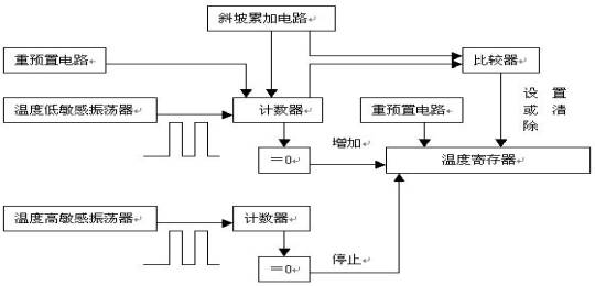 通过改变增加的每1℃内的计数器的计数,斜坡累加电路可以补偿振荡器的非线性误差,以提高精度,任意温度下计数器的值和每一斜坡累加电路的值对应的计数次数须为已知。