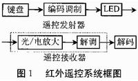 通用红外遥控系统由发射和接收两大部分组成,应用编/解码专用集成电路芯片来进行控制操作,如图1所示。发射部分包括键盘矩阵、编码调制、LED红外发送器;接收部分包括光、电转换放大器、解调、解码电路。