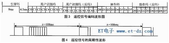 遥控器在按键按下后,周期性地发出同一种32位二进制码,周期约为108ms。一组码本身的持续时间随它包含的二进制“0”和“1”的个数不同而不同,大约在45~63ms之间,图4为发射波形图。