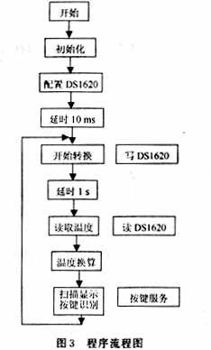 程序的流程图如图3所示,各程序模块均为子程序及嵌套有子程序的调用,其中读、写DS1620模块模块为子程序,完成1个字节的温度值或指令的读写;按键服务模块主要完成对高/低温临界寄存器中TH、TL值的改写。