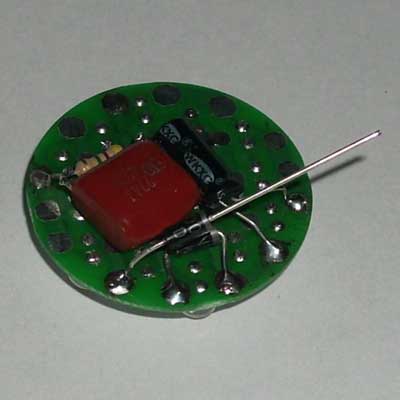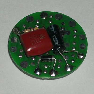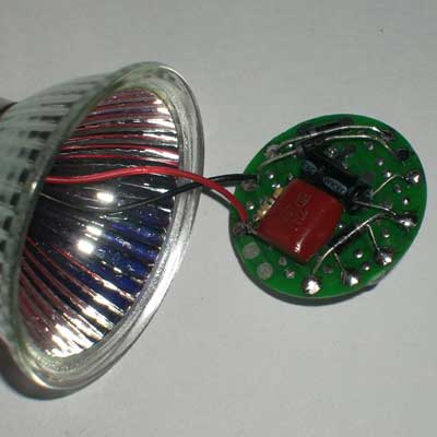 套件说明,罗口的电镀玻璃反光灯杯1只、圆型透明的平面封口玻璃1块、0.8mm高精度双面电路板1块、高亮白光草帽灯19只、400V224高压金属膜限流电容1只、1N4007整流二极管4只、4.7M高压泄流电阻1只、63V10UF消闪烁用滤波电容1只。 制作装配时需要电烙铁、万用表、尖嘴钳、剪钳、热熔胶枪(胶)等工具消耗品请自备。市面上相同功能和特性的LED灯售价高达18元以上,更有高达百元以上的LED灯,现在大家自己动手,只需要十多元就可以立即享用这世界上最新的环保省电LED照明技术!学校组织批量购买,每50套赠送一套备品,免费提供部分元件备品! 电路原理图:工作原理非常简单,通过电容限流了发光二极管的工作电流小于25MA,加上C2吸收了开关灯的冲击电流,有效的确保了发光二极管的使用寿命。采用电容降压,不消耗电能,不发热,效果好。(发光二极管的工作电流由C1的容量决定,如图最大不能超过474,如果发光二极管的工作电流超过了50MA,估计发光二极管的寿命会大大缩短!如果觉采用224亮度已经太亮,可以换容量为104的电容,这样LED的工作寿命会超过几万小时。)