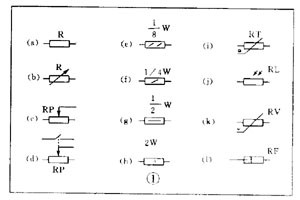 第 3 种是压敏电阻器的符号。压敏电阻阻值是随电阻器两端所加的电压而变化的。符号见图 1 ( k ),用字符 U 表示电压。它的文字符号是“ RV ”。这三种电阻器实际上都是半导体器件,但习惯上我们仍把它们当作电阻器。