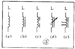 电感线圈在电路图中的图形符号见图 3 。其中( a )是电感线圈的一般符号,( b )是带磁芯或铁芯的线圈,( c )是铁芯有间隙的线圈,( d )是带可调磁芯的可调电感,( e )是有多个抽头的电感线圈。电感线圈的文字符号是“ L ”。