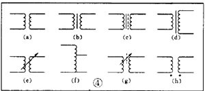 变压器的图形符号见图 4 。其中( a )是空芯变压器,( b )是滋芯或铁芯变压器,( c )是绕组间有屏蔽层的铁芯变压器,( d )是次级有中心抽头的变压器,( e )是耦合可变的变压器,( f )是自耦变压器,( g )是带可调磁芯的变压器,( h )中的小圆点是变压器极性的标记。
