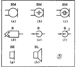 扬声器、耳机都是把电信号转换成声音的换能元件。耳机的符号见图 5 ( g )。它的文字符号是“ B E ”。扬声器的符号见图 5 ( h ),它的文字符号是“ BL ”。