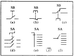 开关在电路图中的图形符号见图 7 。其中( a )表示一般手动开关;( b )表示按钮开关,带一个动断触点;( c )表示推拉式开关,带一组转换触点;图中把扳键画在触点下方表示推拉的动作;( d )表示旋转式开关,带 3 极同时动合的触点;( e )表示推拉式 1×6 波段开关;( f )表示旋转式 1×6 波段开关的符号。开关的文字符号用“ S ”,对控制开关、波段开关可以用“ SA ”,对按钮式开关可以用“ SB ”。