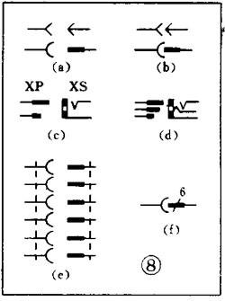 接插件的图形符号见图 8 。其中( a )表示一个插头和一个插座,(有两种表示方式)左边表示插座,右边表示插头。( b )表示一个已经插入插座的插头。( c )表示一个 2 极插头座,也称为 2 芯插头座。( d )表示一个 3 极插头座,也就是常用的 3 芯立体声耳机插头座。( e )表示一个 6 极插头座。为了简化也可以用图( f )表示,在符号上方标上数字 6 ,表示是 6 极。接插件的文字符号是 X 。为了区分,可以用“ XP ”表示插头,用“ XS ”表示插座。