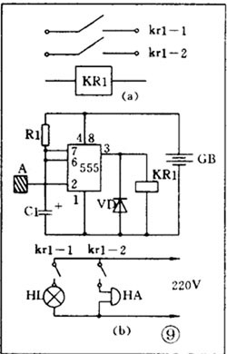 因为继电器是由线圈触点组两部分组成的,所以继电器在电路图中的图形符号也包括两部分:一个长方框表示线圈;一组触点符号表示触点组合。当触点不多电路比较简单时,往往把触点组直接画在线圈框的一侧,这种画法叫集中表示法,如图 9 ( a )。当触点较多而且每对触点所控制的电路又各不相同时,为了方便,常常采用分散表示法。就是把线圈画在控制电路中,把触点按各自的工作对象分别画在各个受控电路里。这种画法对简化和分析电路有利。但这种画法必须在每对触点旁注上继电器的编号和该触点的编号,并且规定所有的触点都应该按继电器不通电的原始状态画出。图 9 ( b )是一个触摸开关。当人手触摸到金属片 A 时, 555 时基电路输出( 3 端)高电位,使继电器 KR1 通电,触点闭合使灯点亮使电铃发声。 555 时基电路是控制部分,使用的是 6 伏低压电。电灯和电铃是受控部分,使用的是 220 伏市电。