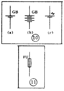 电池的图形符号见图 10 。长线表示正极,短线表示负极,有时为了强调可以把短线画得粗一些。图 10 ( b )是表示一个电池组。有时也可以把电池组简化地画成一个电池,但要在旁边注上电压或电池的数量。图 10 ( c )是光电池的图形符号。电池的文字符号为“ GB ”。熔断器的图形符号见图 11 ,它的文字符号是“ FU ”。