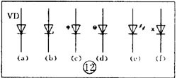 半导体二极管在电路图中的图形符号见图 12 。其中( a )为一段二极管的符号,箭头所指的方向就是电流流动的方向,就是说在这个二级管上端接正,下端接负电压时它就能导通。图( b )是稳压二极管符号。图( c )是变容二极管符号,旁边的电容器符号表示它的结电容是随着二极管两端的电压变化的。图( d )是热敏二极管符号。图( e )是发光二极管符号,用两个斜向放射的箭头表示它能发光。图( f )是磁敏二极管符号,它能对外加磁场作出反应,常被制成接近开关而用在自动控制方面。二极管的文字符号用“ V ”,有时为了和三极管区别,也可能用“ VD ”来表示。