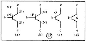 由于 PNP 型和 NPN 型三极管在使用时对电源的极性要求是不同的,所以在三极管的图形符号中应该能够区别和表示出来。图形符号的标准规定:只要是 PNP 型三极管,不管它是用锗材料的还是用硅材料的,都用图 13 ( a )来表示。同样,只要是 NPN 型三极管,不管它是用锗材料还是硅材料的,都用图 13 ( b )来表示。图 13 ( c )是光敏三极管的符号。图 13 ( d )表示一个硅 NPN 型磁敏三极管