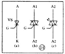晶闸管是晶体闸流管或可控硅整流器的简称,常用的有单向晶闸管、双向晶闸管和光控晶闸管,它们的符号分别为图 14 中的( a )( b )( c )。晶闸管的文字符号是“ VS ”。