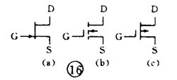 利用电场控制的半导体器件,称为场效应管,它的符号如图 16 所示,其中( a )表示 N 沟道结型场效应管,( b )表示 N 沟道增强型绝缘栅场效应管,( c )表示 P 沟道耗尽型绝缘栅场效应管。它们的文字符号也是“ VT ”。
