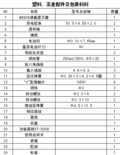市场上有很多种830B的套件,外型大同小异,价格也各有差异,主要是里面的配料一不样,本站套件都是厂家做出口件的配料,成本相对比较高,表笔也比较大,组装好后用起来也比较舒适,欢迎没有用过本站万用表套件的朋友试装,试用。