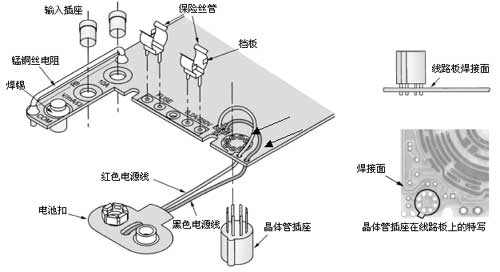 确认晶体管8脚测试座能够容易通过面盖上的对应孔,如果不能,要将面盖上的孔边毛刺修整,直到容易穿过。不要硬推测试插座的管脚,以免损坏它。将晶体管测试座从焊接面插入线路板对应孔,确认测试座上的突头方向对应线路板图示。从元件面将晶体管测试座焊接在线路板上,然后剪去多余的脚。