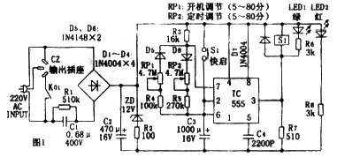 | 选择分类:当前分类——电子入门 相关联或者相类似的文章: 免费抄版软件——文字或图片转PCB文件(31341) 节能灯套件制作说明(9999) USB充电器套件制作说明(3141) 交、直流电大揭秘---通俗理解法(2597) 常用集成电路功能列表(2086) 电子基础知识--电阻篇(1748) 什么是压敏电阻?(1644) 什么是电平?(1644) 什么是“压敏电阻”(1644) [原创]最新智能色环电阻识别程序(1517) 整流电路详解 (1381) 本站免费资料的网址(1329) 爱好捕鱼的朋友千万别错过!(我的电鱼机制作经历)(1322) 测电阻法(1279) 电子基础知识--电感(1239) 充满电磁波的天空 (1194) 识别色环电阻的阻值...(1141) 了解隔离变压器(1116) 电烙铁的妙用(1109) 麻烦的USB硬盘和延长线(电子知识)(1105) 首页 前页 后页 尾页 本站推荐: | 电冰箱外用小型时间控制器 本产品为一种小型的低成本时间控制器,可人为设定不同的开停比,控制冰箱开或停,模拟温控过程。使用本产品可防止因制冷剂泄漏造成不停机而损坏压缩机或因电网间断供电造成的压缩机高压启动受损,也可用于夏季不易停机的特别费电冰箱。该产品成本低(小于10元)、可靠性较高,适合于广大爱好者仿制。 电路原理:电路见图1。 核心为一片555时基电路,在此构成可调占空比的无稳态多谐振荡器。由555的工作原理可知,其③脚输出电压由②、⑥脚的输入电压决定。R3、D6、RP2、R5、C3构成充电支路,当C3上的电压小于2/3Vcc(Vcc为555的工作电源电压)时,③脚输出高电平,K1释放,LED1熄灭;一旦C3上的充电电压升高至2/3Vcc时,则555内部RS触发器翻转,③脚输出低电平,K1吸合,LED1点亮,同时⑦脚内部的放电管对地导通,C3通过R4、RP1、D5支路对⑦脚放电,直到C3上的电压降至1/3Vcc时,⑦脚停止放电③脚又恢复输出高电平;此后C3又通过充电支路进行充电,……周而复始。充电时间T1=0.693(R3+R5+RP2)C3 放电时间T2=0.693(R4+RP1)C3 设计中R3取16kΩ,R4取100 kΩ,R5取270 kΩ,RP1、RP2均取4.7 MΩ的电位器,C3为1000μF的低漏电铝电解电容器,则T1、T2的定时最长可达约54分钟。由于C3漏电流的存在,实际定时可达80分钟。 电路中,RP1、RP2分别为开机调节及定时调节电位器,LED1、LED2分别定时、电源指示。R1、C1、D1~D4及C2、ZD、R2等组成简单的电容降压稳压电路,提供555时基电路及继电器K1的工作电源。开机后,电路自动进入延时启动状态,如需快速启动,可按一下轻触开关S1,则可实现快启功能。 ![]() 制作及使用:该电路焊制在一小块印制板上,制成后的外型如图2所示。C1需选用耐压大于400V的聚丙烯电容器,本人使用的是进口的MKP型低损耗电容,效果良好。K1可选触点电流大于5A的高灵敏度继电器。C3应选用漏电尽可能低的电解电容器,这样生产时的一致性较好,不然时间误差会很大。 制作完成后,一般情况无须调试。将电冰箱插入CZ上,RP1、RP2调于最小位置(均为5分钟定时),通电后LED2亮。约5分钟后,LED1熄灭、K1释放。如果实现开机时快启,只需按一下S1即可。调节RP1、RP2,即可完成不同的时间通断比,使接于CZ上的电冰箱受其控制而实现节能。 1、 本站不保证以上观点正确,就算是本站原创作品,本站也不保证内容正确。 2、如果您拥有本文版权,并且不想在本站转载,请书面通知本站立即删除并且向您公开道歉! |