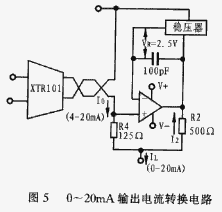 利用图5所示的电路可以把XTR101传输的4~20mA输出电流转换为0~20mA电流。
