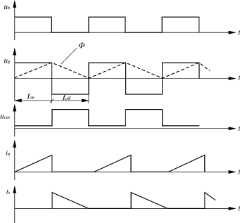 图2中ub为Vp的控制电压波形;up为变压器初级Np电势波形;φ为变压器磁通变化波形;uces为V7集电极电压波形;ip、is为初、次级电流波形。