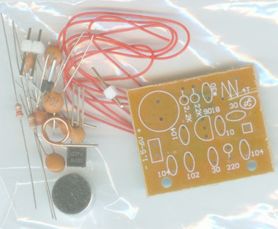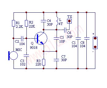 MIC是驻极体话筒,它的作用就是感应空气中声波的微弱振动,并输出跟声音变化规律一样的电信号。本站选用的是灵敏度较高的话筒,一般可以输出几十毫伏以上的音频信号,这个信号足以调制下一级的高频振荡信号的频率。注意:话筒有正负极之分,一般和外壳相通的是负极。 R1是MIC驻极话筒的偏置电阻,有了这个电阻,话筒才能输出音频信号,这是因为MIC话筒内部本身有一极场效应管放大电路,用来阻抗匹配和提高输出能力等作用。注意:话筒不要选灵敏度太高的话筒,否则容易出现声反馈,出现自激叫声。 C2是音频信号耦合电容,将话筒感应输出的声音电信号专递到下一级。 C3是Q9018的基极滤波电容,一方面滤除高频杂音,另一方面让Q9018的高频电位为0,对50MHz以上的高频电路来说,Q9018是一个共基极放大电路,这是最后能形成振荡的基础。因为振荡电路的基础条件就是必须具备一定的增益,再就是具备合适相位的反馈(一般是正反馈)。 R2是Q9018的基极偏置电阻,给Q提供一个较小的基极电流,Q将会有一个较大的发射极电流到过R3。由于R2、R3中的电流作用会在各自电阻上产生压降并互相影响,结果会自动稳定在某一数值状态,这就是书上讲的射极跟随器,直流负反馈不稳定直流工作点的作用。 R3是Q9018的发射极电阻,这里起稳定直流工作点作用,和C7还组成了高频信号负载电阻作用,也是整个高频振荡回路的一部分。 C4和L组成并联谐振回路,起到选择振荡频率的主要作用,改变C4的容量或者改变L的形状(包括圈数),可以方便的改变发射频率。 C6是高频信号输出耦合电容,目的是为了让高频信号变成无线电波幅射到天空中。因此,天线最好坚直向上,长度最好等于无线电波频率波长(或者整数倍),四周应该开阔,不要有金属物阻挡。说明:波长等于频率的倒数,频率变化,波长也会变化,再说,天线具体的长度还与电路输出阻抗、天线粗细等等有关,在业余情况下,随便接一段电线就行了。(如果为了追求最远的发射距离,大家可以自行多做这方面的尝试,本站元件包经过本站技术人员试验,效果是可以轻松达到50米以外的。) C5是反馈电容,电路起振的关键元件就是它了。分析本电路的高频状态时,集电极是输出,发射极是输入,输出信号通过C5加到输入端,产生强烈的正反馈,自然就产生振荡了。这实际上也就是书中所说的电容三点式振荡电路。 C1是电源滤波电容,给交流信号提供回路,减小电源的交流内阻。