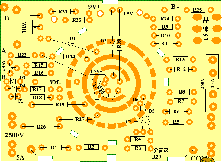 。 它的显示表头是一个直流μA表,WH2是电位器用于调节表头回路中的电流大小,D3、D4两个二极管反向并联并与电容并联,用于保护限制表头两端的电压起保护表头的作用,使表头不至电压、电流过大而烧坏。电阻档分为×1Ω、×10Ω、×100Ω、×1kΩ、×10kΩ、几个量程,当转换开关打到某一个量程时,与某一个电阻形成回路,使表头偏转,测出阻值的大小。 它由5个部分组成:公共显示部分;直流电流部分;直流电压部分;交流电压部分和电阻部分。线路板上每个档位的分布(见图8),上面为交流电压档,左边为直流电压档,下面为直流mA档,右边是电阻档。 图7 MF47型万用表的测量线路板印刷电路