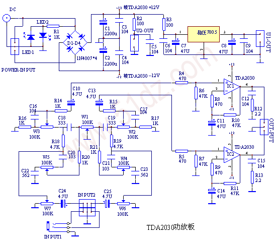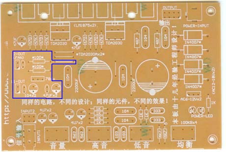 用双电源供电可以更加充分的发挥2030的效能,双电源供电时,交流声纹波正负互相抵消,即使只用220UF的滤波电容也很难听到交流声,为了改善低音效果,滤波电容不能小于1000UF,选用2200UF比较合适。如果还要选取更大的滤波电容则没有意义,相反,会使开机、关机、短路冲击电流更大,容易损坏元件。