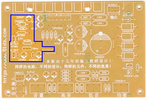 注意,板上蓝线圈住的地方,就是本站原理图里虚线框的一部分,没有配(装配)元件,因为那是本站工程师为了方便大家扩展,装多一个风扇给予充分的散热而备用的。对于此功放来说,本站配的散热片已足够散热,不安装一样能正常工作。