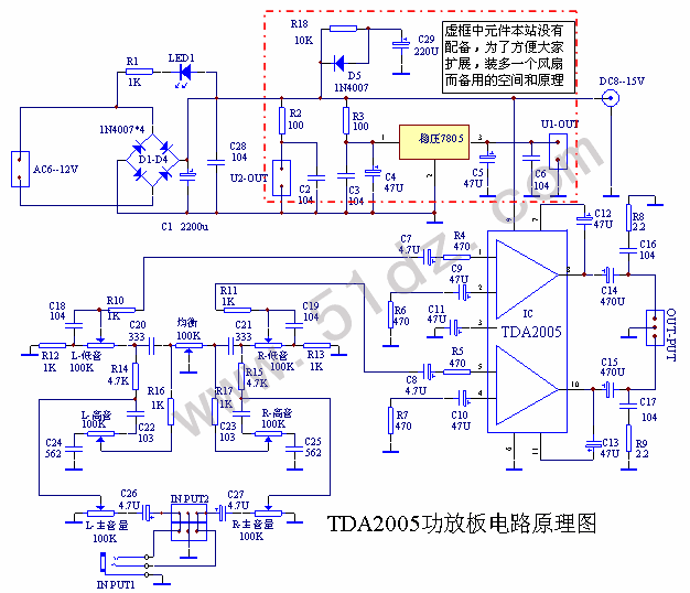 五一电子长期为大家提供实践动手的机会,想体验亲自动手装功放的朋友,请赶紧采取行动。套件配有原理图,制作说明,元件清单,请大家放心大胆的制作。可以偿试一下一装就响的成就感。 TDA2005也可用TDA2004或TDA2009代换。