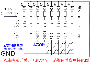 2、以上是基本的开关控制功能,大家只用几路开关,就只给相应的引脚接线,将其它不用到的引脚留空即可。因此本芯片可以做8路或者8路以下的任意路数开关控制。