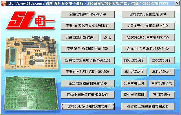 点这里查看两张配板光盘之一的STC光盘文件目录!另外,由于五一电子注重从电子基础教育入手,在三年之内不打算象别的网站那样加入很多种类的单片机,那样做的目的,虽然给高端用户增加了很多选择和机会,但是,对单片机入门学习是很不利的。本站郑重承诺,本站不但出售51单片机,还要进行相关的技术培训,购买了本站51单片机的用户如果学不会,本站培训学费一定优惠减免;购买了别站51单片机的用户,本站培训费用一定实价实收。