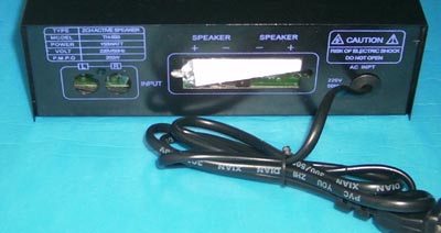 后面板: 喇叭输出端子是线夹,信号输入端是莲花插座,电源线