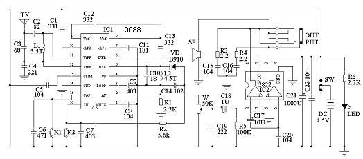 TDA9088是一块自动扫描频率的单片收音机电路。高频广播信号经天线接收,C2、C3、C4、L1选频网络选频后从IC的11脚、12脚输入,5脚为本机振荡回路,两路信号经内部混频,从IC的8脚输出70KHz的中频信号,后经⑨脚输入到内部放大鉴频后从2脚输出音频信号。1脚为静噪控制,当接收不到信号或信号比较弱时,使2脚输出信号衰减很大,实现静噪。16脚为扫描频率控制端,当电源接通,输出控制信号加到变容二极管B910上,使其容量从高到低发生变化,使本机振荡频率从低到高发生变化,也就是接收频率从低端向高端扫描,当收到一定强度的信号即停止扫描,锁定在当前频率,此时按下K2电路继续向高频率端扫描。15脚为复位脚,当扫描到最高频率后,不能再向频率低端扫描,要跳到低端频率只能按复位按钮复位电路,再向高端扫描。