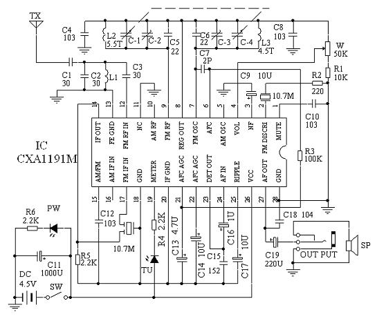 FM广播信号经天线接收后由C1、C2、C3、L1组成的带宽滤波电路滤波,除去88.0MHz--108.0MHz以外的信号,然后从IC的12脚输入到内部进行高频放大,再经9脚外围元件C5、PVC、L2选频回路选出要接收的广播信号去与7脚外接的C6、PVC、L3、C7组成的本振回路混频,从IC CXA1191的14输出10.7MHz的中频信号,经10.7MHz的中频滤波器滤掉10.7MHz以外的信号后从17脚输入到内部进行中频放大,后经内部电路和2脚所接的陶瓷晶振组成的鉴频电路鉴频,从23脚输出音频信号。23脚输出的音频信号很小,通过C16再从24脚送入内部进行音量控制、功率放大后,最后才从27脚输出,经C19推动喇叭发声。15脚为波段选择引脚, AM接收时接地,FM接收时接103瓷片电容对地。19脚为调谐指示引脚,收到一定强度的信号后输出低电平。4脚为电调音量控制端。