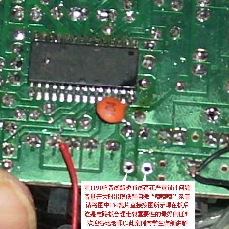 装配注意事项:电路原理图中的C18陶瓷电容,不能按照线路板上的安装位置安装,必需按图示位置焊接在板背后。为什么?该电容主要用来给高频信号提供短路回路,以滤除残余在音频信号中的高频信号,改良音质的同时也有一定的去加重作用,但是,该电容的冷端(地线、公用线或者靠近地线、公用线的一般俗称为冷端)距离1191IC的地线路太长,高频信号在这段线路板上产生了较高的压降,该压降反馈到输入端,导致IC内部信号放大电路阻塞从而产生杂音。因此,大家以后在设计线路板时,一定要考虑信号的回路,每个信号都有自己电流回路,而信号之间最好不要互相影响。现在很多集成电路都是数字和模似混合集成电路,既有数字接地,又有模拟接地,有的还有前级地、后级地,大家在设计电路时一定要多花心思,必要时可以做试验再改良。