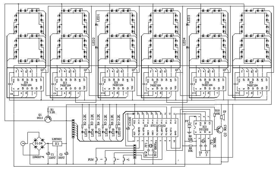 大长条数字钟套件:板尺寸460×90mm,采用STC12C1052单片机芯片和6个串入并出芯片74HC164完成六位数显示。采用专用走时电路DS1302,断电后数据不丢失,在不接外电的情况下可继续走时三个月。带通用输入插座及整流稳压电路,使用方便。六位数时、分、秒和年、月、日切换显示,显示时间的时候比较亮,不闪烁;显示日期的时候比较暗,且闪烁。。