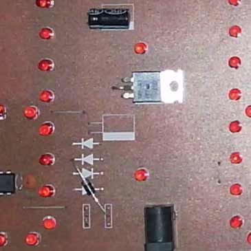 二极管的正极插在右边插座中间的插针位置,负极插到从下往下数第二个二极管的负极。这样不管是交流还是直流都可以直接插入DC座。新版没有使用交流和直流切换插针,在电源输入插座输入交、直流都可以(6V--9V),同时,由于板比较长,在邮寄中有时需要把板分开成两段(下图),你收到货后通过8根跳线即可方便的连接好,如果使用的是8根软导线,那就是一个可以折叠的数字钟了。
