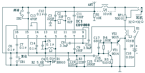 9088是一块自动扫描频率的单片收音机电路。高频广播信号经天线接收,C2、C3、C4、L1选频网络选频后从IC的11脚、12脚输入,5脚为本机振荡回路,两路信号经内部混频,从IC的8脚输出70KHz的中频信号,后经⑨脚输入到内部放大鉴频后从2脚输出音频信号。1脚为静噪控制,当接收不到信号或信号比较弱时,使2脚输出信号衰减很大,实现静噪。16脚为扫描频率控制端,当电源接通,输出控制信号加到变容二极管B910上,使其容量从高到低发生变化,使本机振荡频率从低到高发生变化,也就是接收频率从低端向高端扫描,当收到一定强度的信号即停止扫描,锁定在当前频率,此时按下K2电路继续向高频率端扫描。15脚为复位脚,当扫描到最高频率后,不能再向频率低端扫描,要跳到低端频率只能按复位按钮复位电路,再向高端扫描。