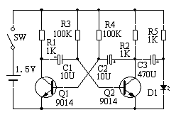 C:本电路是一个典型的多谐振荡电路。由Q1、Q2交叉耦合而成。R1、R2分别是Q1、Q2的集电极电阻。R3、R4分别是Q1、Q2的基极偏置电阻。多谐振荡器没有稳定状态,要么Q1截止、Q2导通;要么Q1导通,Q2截止,这两状态周期性的自动翻转,D1、D2周而复始的交替点亮。