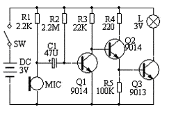 R1为话筒MIC的偏置电阻,R2、R3使Q1处于临界截止状态,当话筒MIC接收到音频信号后,通过C1耦合给Q1基极,在音频信号的正半周加深Q1的导通,Q1还是导通,同时把Q2的基极电位拉低,Q2截止,对电路没有多大影响;在音频信号的负半周使Q1反偏压截止,Q2导通,Q3也导通,小灯炮点亮。由于电容C1充放电需要一个过程,所以小灯炮点亮后会延时一段时间。调整C1的大小可以改变点亮后延时熄灭的时间,容量小延时时间短,容量大,延时时间长,可以在1微法到几百微法选取。改变R2阻值的大小可以改变Q1临界截止度,也就是改变灵敏度,阻值大,灵敏度高,反之则低。
